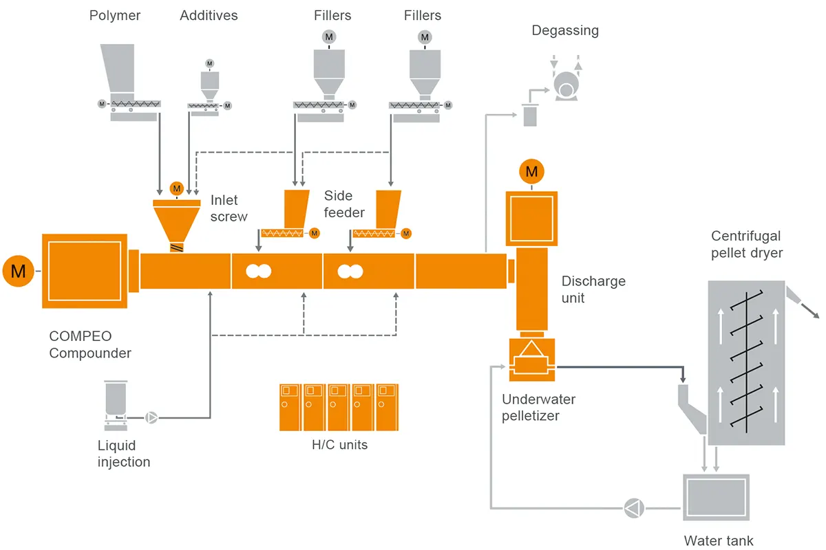 高充填ビチューメンコンパウンドは伝統的にバッチ式内部混練機による処理で製造されます。この確立された製法には柔軟性、少量の成分でもオフラインで簡単に投与できること、滞留時間や混練時間が可変であることなどの利点がありますが、中間貯蔵時間や個々のバッチ間の特性のばらつき等の制約も存在します。これに対して連続プロセスは均一なプロセス条件、狭い滞留時間分布、プロセスステップの統合などにより、その典型的な長所を発揮することができます。さらにブッス・ニーダーは正確な温度制御、ビチューメンとポリマー/エラストマーの大きな粘度差の処理、フィラーの比率が最も高い場合でも完全な混練が可能などの利点を備えています。