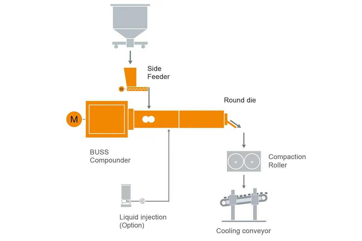 ブッスの混練技術では、2または3か所に供給口を分けたり、サイドフィードスクリューなどの供給方法の採用、フィラーの重量による独立供給、バックベントによる混入した空気の除去、優れた搬送効率などにより、最大90%のフィラー投入が可能です。適度なせん断速度により、このような高投入量でも極めて高い粘性の材料を扱うことができます