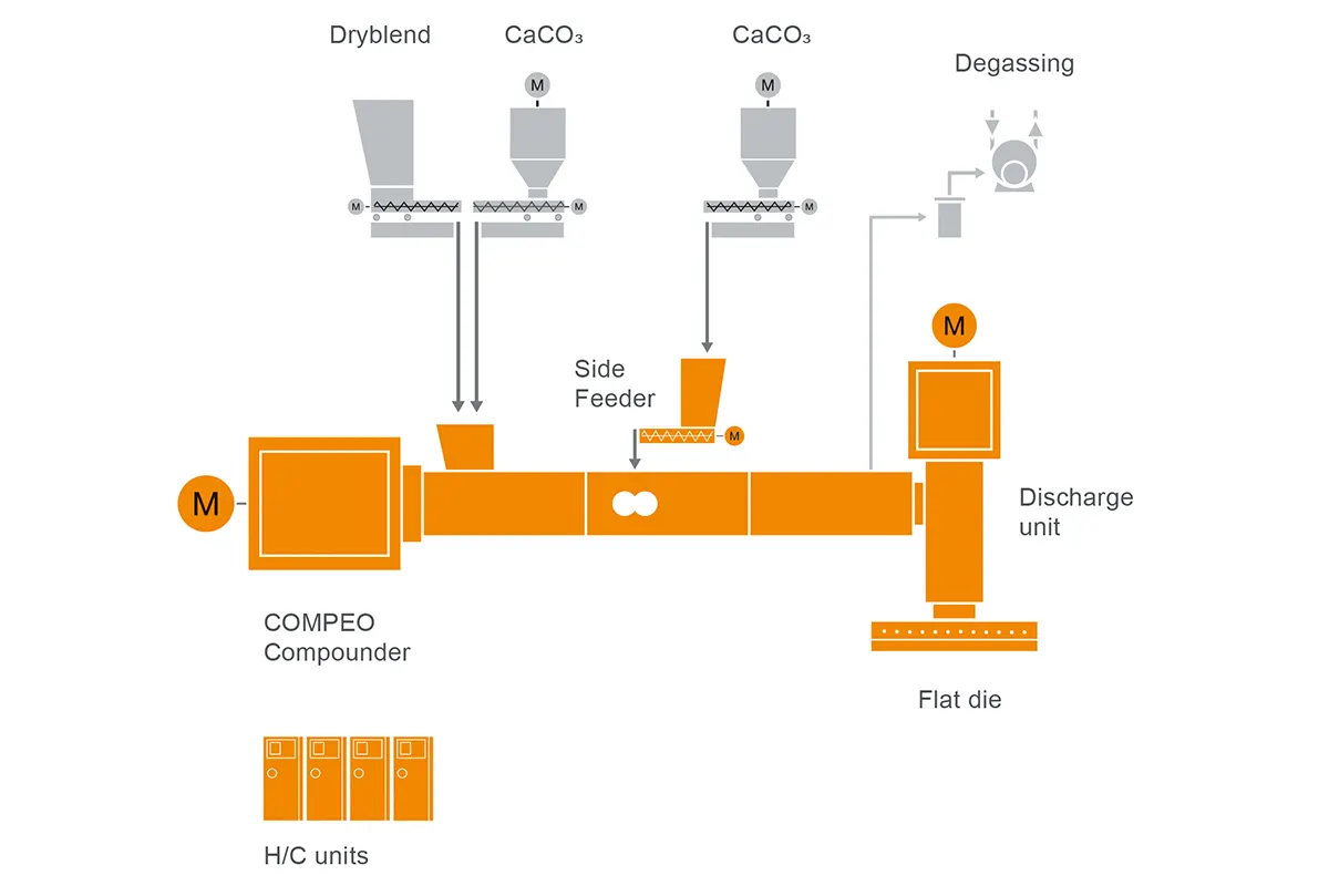 この最適化されたプロセスでは、LVTフローリングの3層コアが2台の押出機と2台のカレンダーで製造されます。一番目のブッス・ニーダーでは、高比率のミネラルフィラーやその他の添加物をサイドフィーダーとスプリットフィーダーを介して導入したPVCコンパウンドが可塑化および均質化されます。フィッシュテールノズルに供給するための昇圧はフランジ付きの排出押出機によって行い、混錬ステージを確実に分離します。その後、第一のカレンダーでコンパウンドがグラスファイバーマットに塗布されます。これを第二カレンダーに投入し、第二ブッス・ニーダーで調製したPVCコンパウンドをグラスファイバーマットの反対側に塗布します。