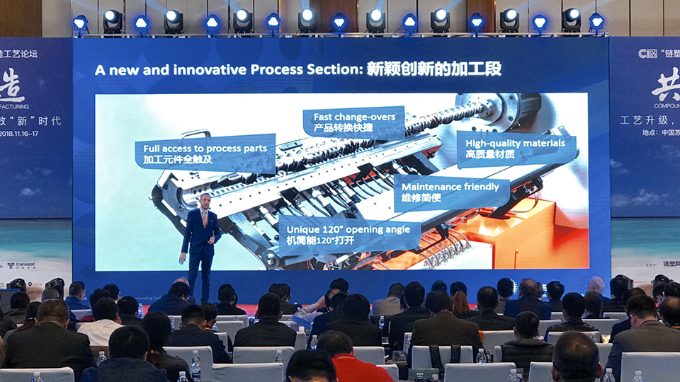 連続混練システムの世界的リーダーであるBuss AGの中国子会社BUSS Compounding Solutions (Shanghai) Co., Ltd.は、スポンサーとしてこのサミットのサポート役を務めました。Buss AGのプロセスエンジニアであるDino Kudrassは、次世代に向けた新型連続混練機「COMPEO」に焦点を当てた『製造に付加価値をもたらすフレキシブルな混練プロセス』と題するプレゼンテーションを行いました。ブッスの新型混練機「COMPEO」の機能と技術を説明するこのプレゼンテーションは、聴衆に深い感銘を与えました。プレゼンテーション後、多数のゲストがブッスとの関係構築に関心を示しました。