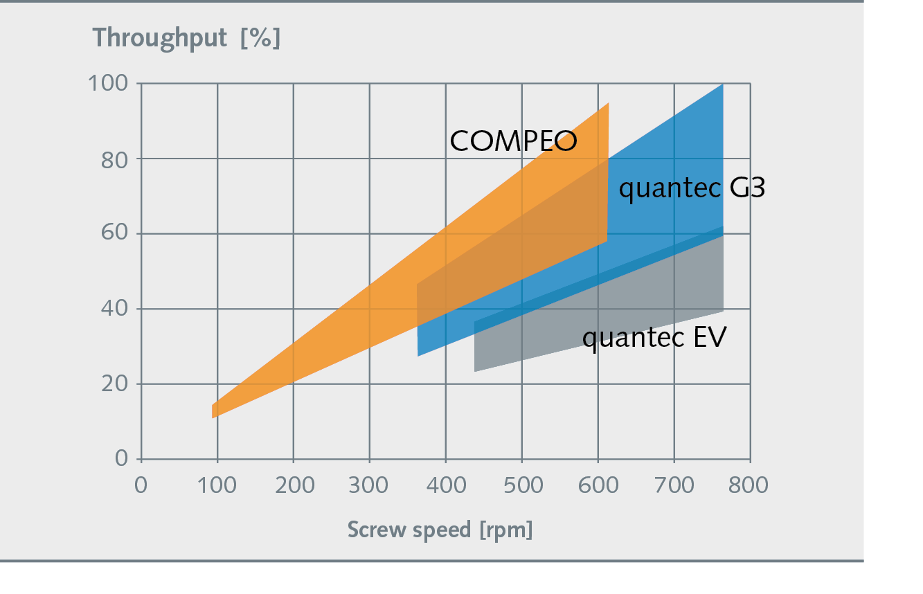The COMPEO process window with a throughput ratio of 1:6, here using PVC as an example, is considerably larger than those of previous Kneader series machines.