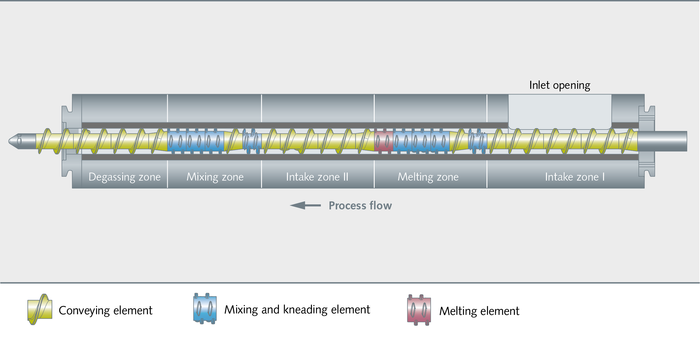 There is a basic version with two intake zones. Polymers, additives and some of the fillers are fed through the first inlet opening into the process section. In the melting zone, the polymers are molton and mixed with the additives. In the second feed zone, further fillers are added and distributed homogeneously into the downstream zone. Volatiles and air are removed in the degassing zone before transfer to the discharge unit. For customer-specific and tailor-made solutions, the processing length, type and number of feeders, temperature, degassing and process geometries are defined according to the compounding application.