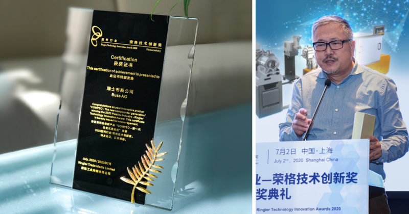 On July 2, Ringier Industrial Media hosted the “2020 Rubber and Plastic Innovative Materials Application and Processing Technology Summit Forum” held in Shanghai. After winning the Ringier Technology Innovation Award in 2012 and 2019, BUSS´s new compounder generation COMPEO wins “2020 Plastics Industry – Ringier Technology Innovation Award” again. Mr. Pingping Jiang, Professor and Doctoral Supervisor of the College of Engineering, presented the prize to Mr. Rongbao Gao, General Manager of BUSS Compounding Solutions (Shanghai), emphasizing that technological innovation is the cornerstone of BUSS AG.