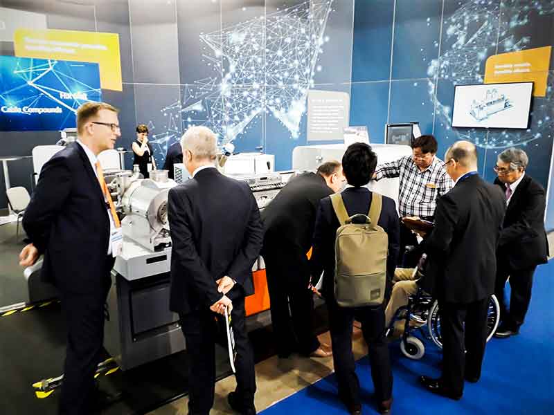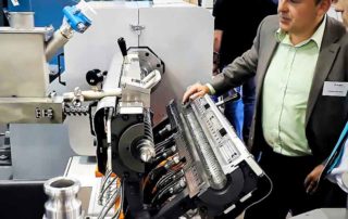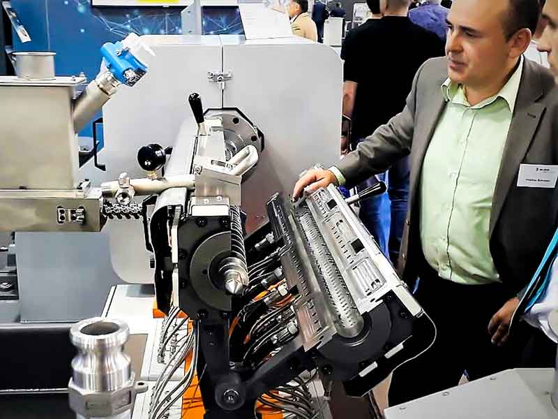 Around the process section we were able to present the enlarged inlet opening with venting option, the excellent accessibility of the process section with a unique 120° opening angle and the degassing at the discharge unit. The new COMPEO twin screw discharge unit attracted great interest, too.